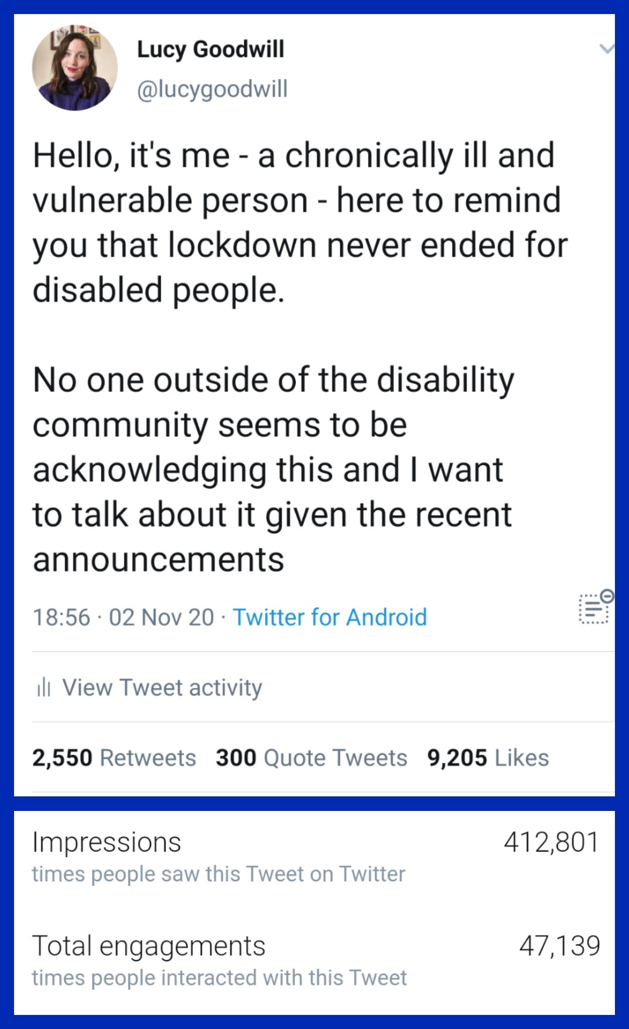 I got so overwhelmed by the feeling of my experience being erased that I took to Twitter and wrote a lengthy thread on the topic, sharing my frustration at non-disabled people’s attitudes, behaviour and lack of self-awareness. I thought it would be a scream into the void, a release to make myself feel better, as well as maybe making a few other disabled or vulnerable people feel seen, and perhaps encouraging one or two non disabled people to think or act differently as well. What happened next was completely unexpected.